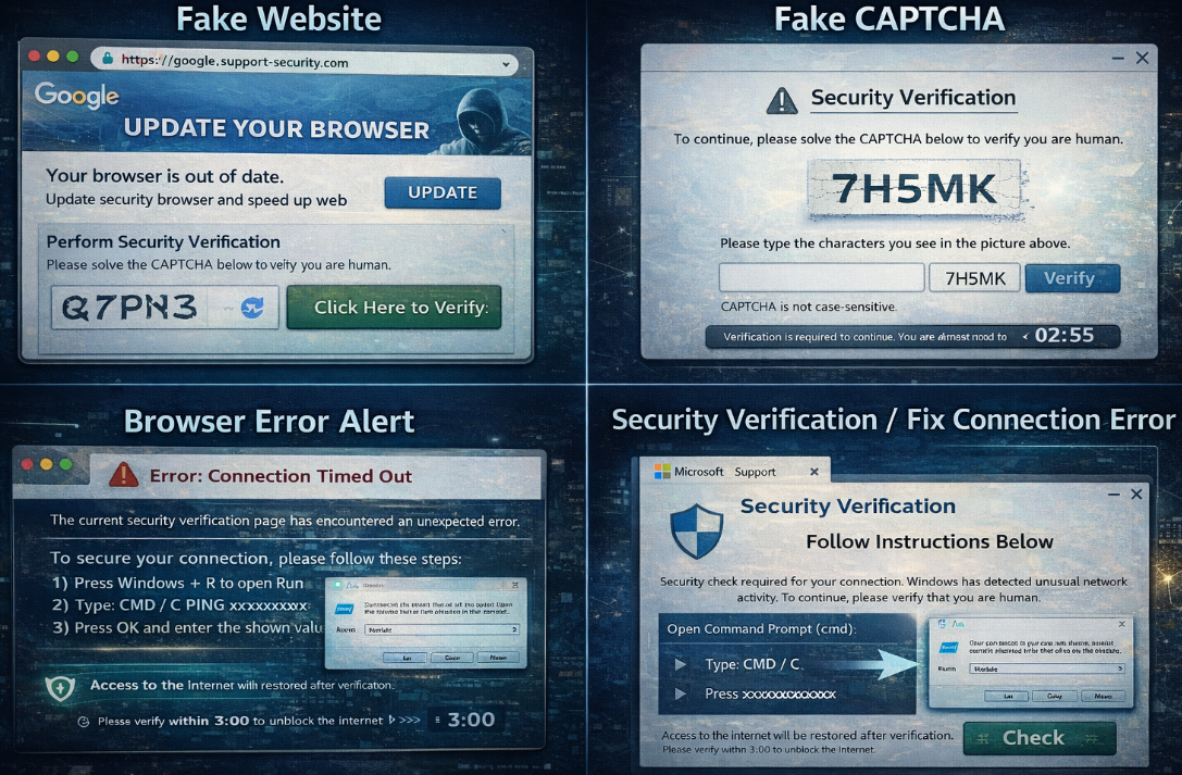 Chiến dịch tấn công nào cũng có giai đoạn dò quét ban đầu, mục tiêu chính của bước này kaf đánh lừa người dùng tự tay thực thi lệnh độc hại. Tại đây nạn nhân sẽ được điều hướng và dẫn dụ thông qua: Website giả mạo, CAPTCHA giả, thông báo lỗi trình duyệt hoặc trang “Security Verification” hoặc “Fix Connection Error”.