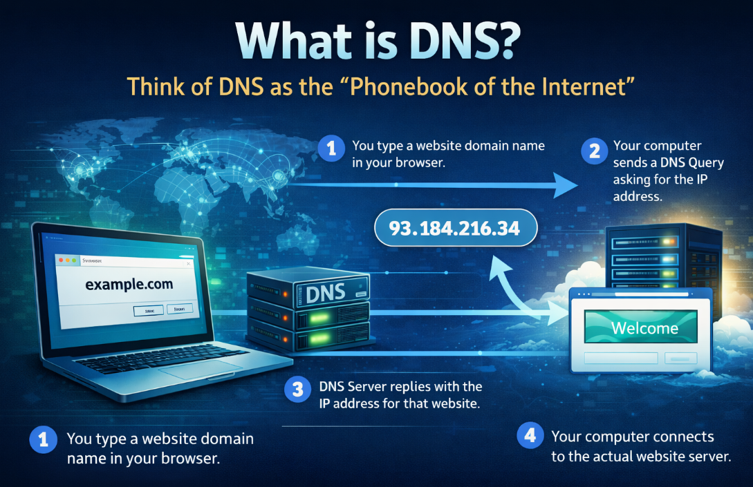 example.com.Máy tính gửi DNS query hỏi: “IP của website này là gì?”.
